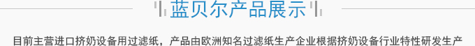 濟(jì)南藍(lán)貝爾工貿(mào)有限公司主要產(chǎn)品擠奶設(shè)備過濾紙,牛奶過濾紙,擠奶機(jī)過濾袋,目前主營進(jìn)口擠奶設(shè)備用過濾紙,產(chǎn)品由歐洲知名過濾紙生產(chǎn)企業(yè)根據(jù)擠奶設(shè)備行業(yè)特性研發(fā)生產(chǎn),產(chǎn)品符合歐盟食品接觸標(biāo)準(zhǔn)及FDA食品接觸標(biāo)準(zhǔn),產(chǎn)品在擠奶設(shè)備過濾紙行業(yè)占有70%以上的份額。并通過了SGS標(biāo)準(zhǔn)技術(shù)檢測(cè)中心按國標(biāo)食品級(jí)標(biāo)準(zhǔn)進(jìn)行的檢測(cè)。產(chǎn)品適用于各種擠奶設(shè)備品牌,本公司目前獲得該區(qū)域產(chǎn)品營銷資格。產(chǎn)品已用于國內(nèi)各大乳企所屬...